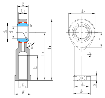 產品特點:鑲墊桿端關節軸承桿端體材料是碳鋼,表面鍍鋅,滑動表面鑲入青銅襯墊;內圈材料是軸承鋼,淬火,球面鍍硬鉻,除了孔徑小于6.35外,其余均可通過油杯潤滑。