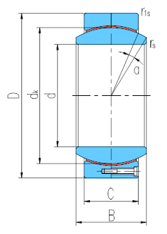 產品特點:外圈徑向分為兩半,用螺釘鎖緊,材料為碳鋼,磷化,球面粘貼PTFE編織物;內圈材料為軸承鋼,淬火,球面鍍硬鉻。