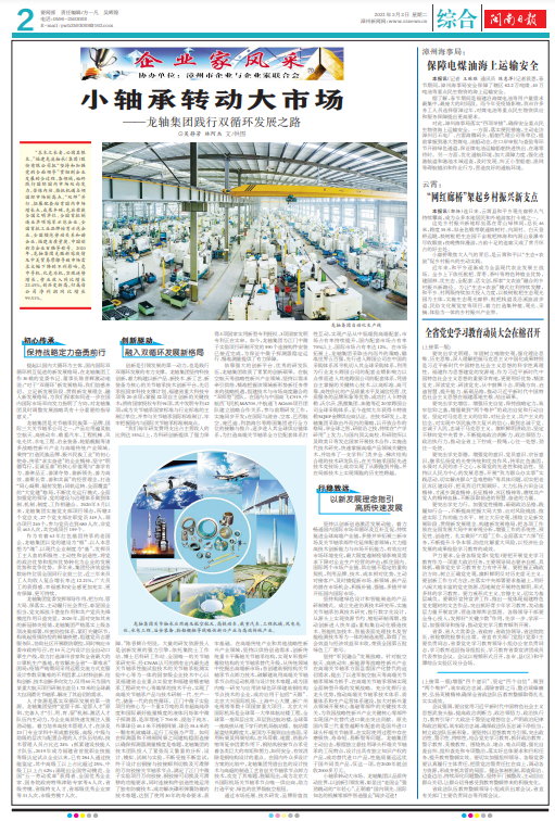 “求木之長者,必固其根本。”福建龍溪軸承(集團)股份有限公司把“堅持和加強黨的全面領導”貫徹到企業發展的全過程、各領域,始終踐行國際國內市場雙向發力,苦練內功、搶抓機遇占領國際市場制高點,“雙師”并行、拓展配套培育國內市場增長點,成果豐碩,先后榮獲全國文明單位、全國首批制造業單項冠軍示范企業、全國首批工業品牌培育示范企業、全國模范勞動關系和諧企業、福建省質量獎、中國創新力企業百強等稱號。2020年,龍軸集團克服新冠疫情及中美貿易摩擦導致市場需求大幅下降的不利影響,危中尋機、化危為機,實現逆勢增長,營業收入同比增長22.45%,創歷史新高,歸屬母公司凈利潤同比增長99.51%。
