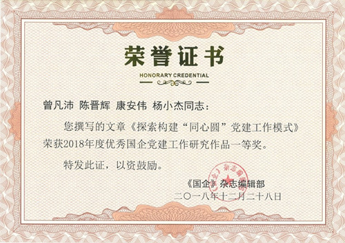 近日,《國企》雜志編輯部依據(jù)文章主題、文字闡述等質(zhì)量評(píng)審要素,對(duì)刊載于2018年度《國企·黨建》雜志的文章進(jìn)行評(píng)審,按黨建理論研究、工作研究、宣傳報(bào)道3大類評(píng)選出108篇優(yōu)秀作品。由公司黨委書記、董事長(zhǎng)曾凡沛主持撰寫的《探索構(gòu)建“同心圓”黨建工作模式》榮獲2018年度優(yōu)秀國企黨建工作研究作品一等獎(jiǎng)。