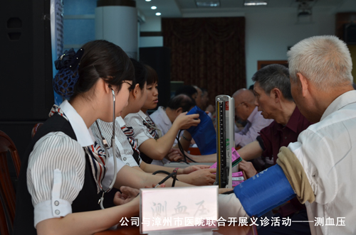 2013年3月23日下午,公司與漳州市醫院聯合舉辦學雷鋒志愿者活動,漳州市醫院體檢中心護士長郭培琴組織6名專家醫生李大新、吳召南、林華東、徐守基、方苑心、徐欽桂及8名護士到公司俱樂部開展義診活動。此次義診活動的范圍包括各科(類)疾病,如內科、外科、心胸科、眼科、骨科、血液科、腫瘤科、內分泌科、心腦血管科等,活動實行“五不”原則,即不登記、不收費、不賣藥、不推薦醫生、不推薦醫院。