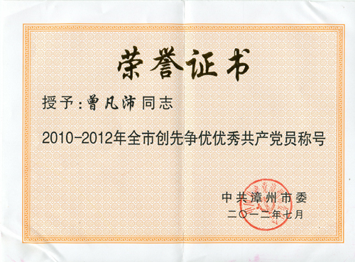 創先爭優優秀共產黨員(曾凡沛) 漳州市委