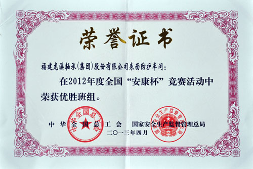 國家級 2012年 全國“安康杯”競賽優勝班組 全國總工會、國家安監總局